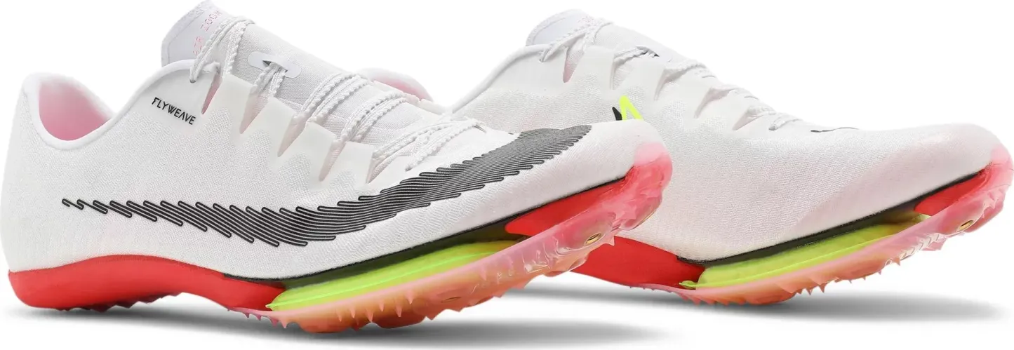 ナイキのトラック用スパイク、エア ズーム マックスフライは、2021 年 4 月に 100 ~ 400 メートルおよびハードル用に登場します。軽量で形状保持力(耐久性)の高いウーブン素材とシンセティック素材の複合アッパー、最高レベルの伸縮性を実現する「ダブルズームエア」、フルレングスのランニングシューズでおなじみのカーボンプレート。特に前足部には、蹴り出しに優れ、かつてない高反発で推進力をサポートする「ダブルズームエア」を搭載しているのが特徴。